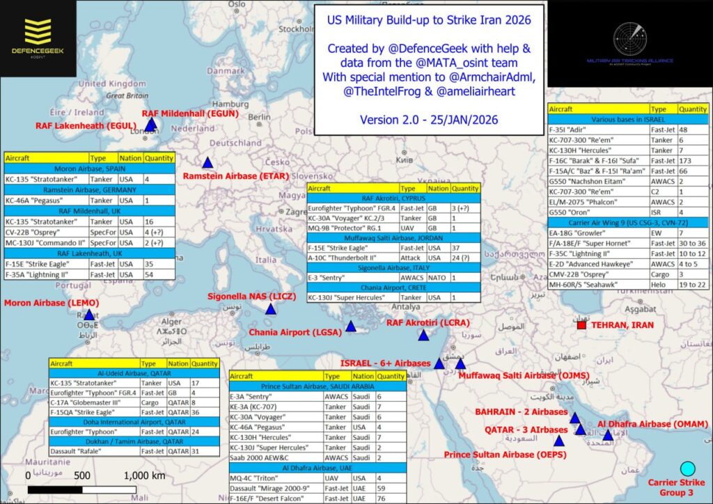 Current force deployments indicate that the United States and Israel possess a substantial military aviation presence in the Middle East, capable of conducting a large-scale air and missile strike against targets inside Iran should a decision be made to do so.